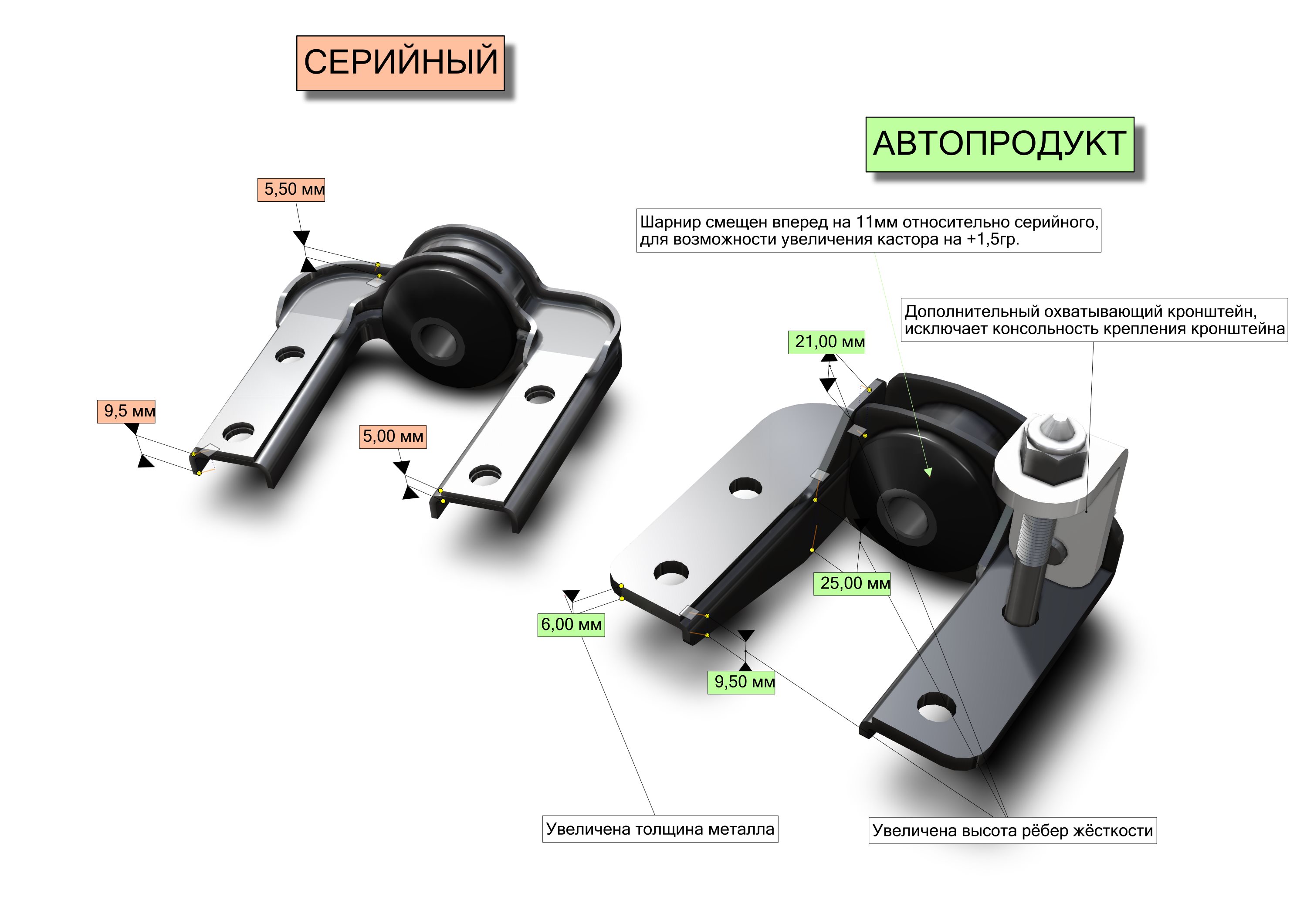 - Регулировка кастора более 2. Конструкция позволяет выставить продольный угол наклона стойки (кастор) в диапазоне, недоступном для серийного. Это обеспечивает идеальный самовозврат руля и стабильность в поворотах на высокой скорости.