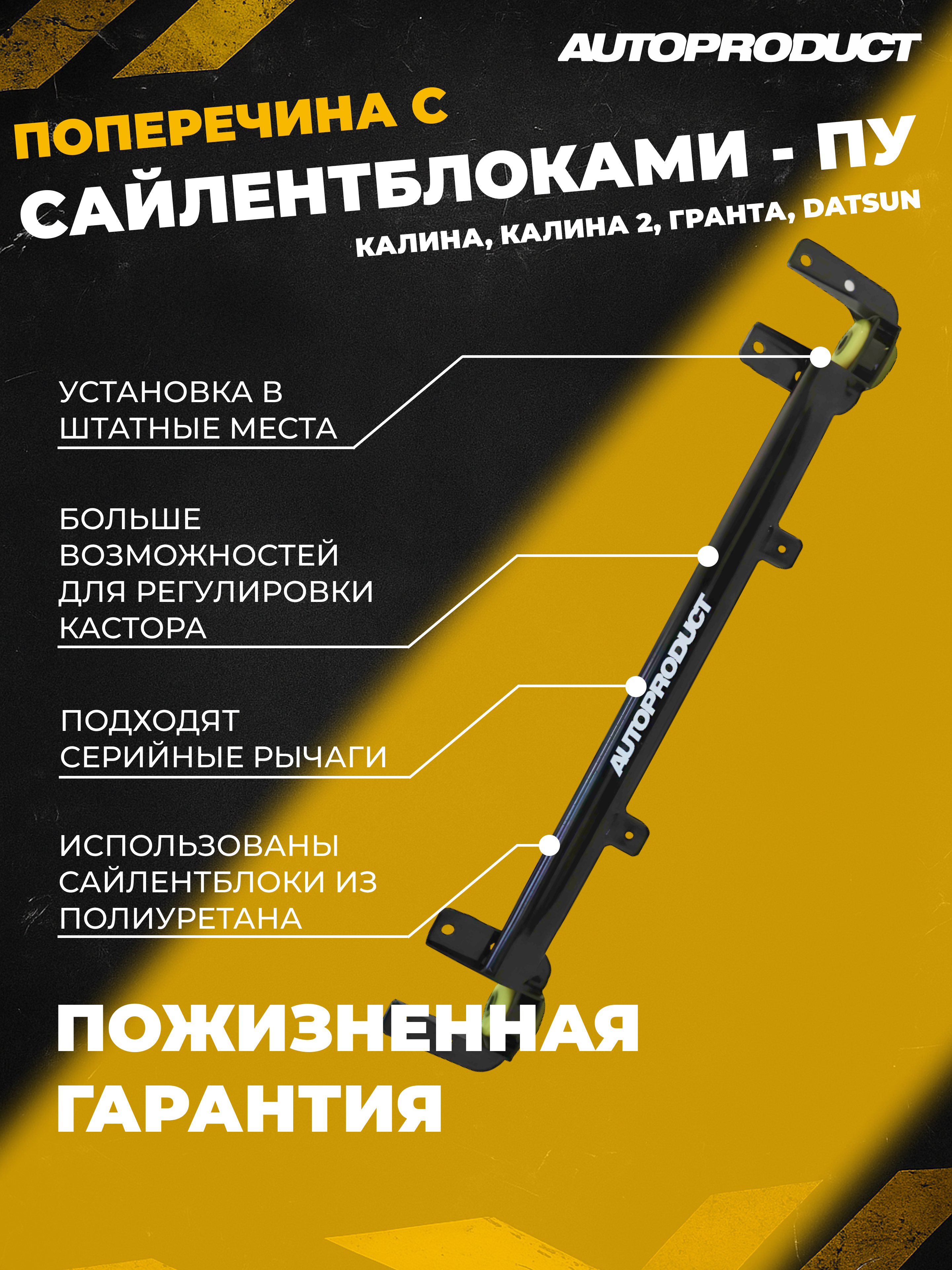 Используется полиуретановый сайлентблок, который имеет большую жёсткость и повышенный ресурс, в сравнении с резиновым, что снижает люфт и свободный ход рычага подвески. Уменьшилась склонность к сносу передней оси, а при торможении и разгоне снижается эффект клевка. Авто едет ровнее, плавнее и безопаснее вы чувствуете контроль в любой ситуации.