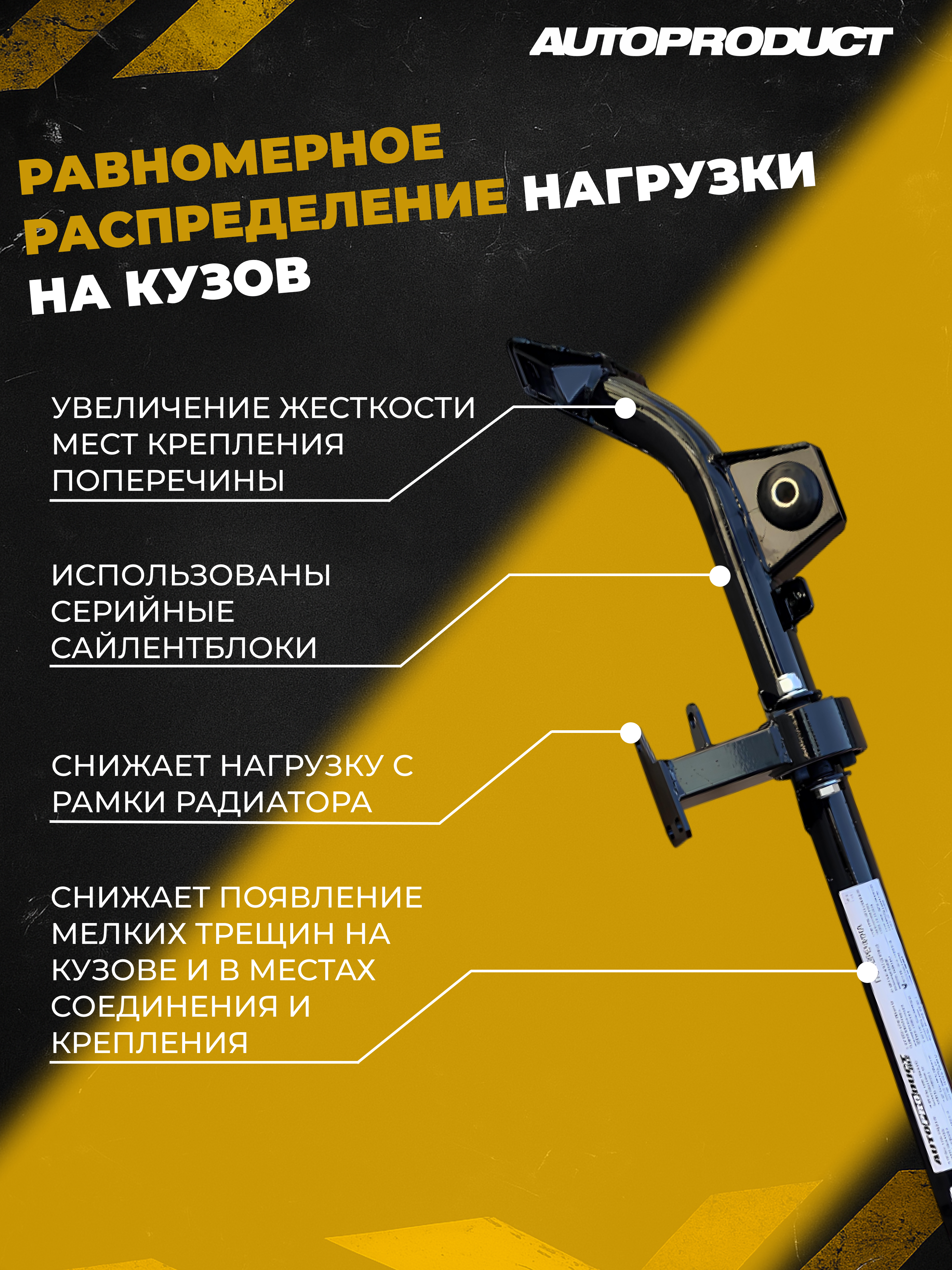 Поперечина ставится прямо в штатные места. Кузов в местах крепления становится жестче, подвеска работает правильнее, нагрузки распределяются равномерно. Машина меньше гуляет на неровностях и четко реагирует на руль. Управление становится точным, а кузовные элементы служат дольше.